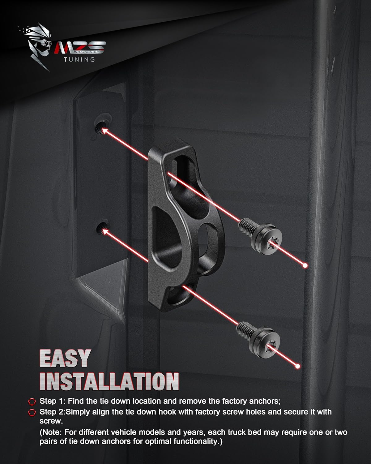 - Easy to Install: Simply align the tie down hook with factory screw holes and fix it with supplied screw. No special tools needed, you will get a secure anchor point in minutes (If the provided screws is not suitable, the original screws can be used directly)