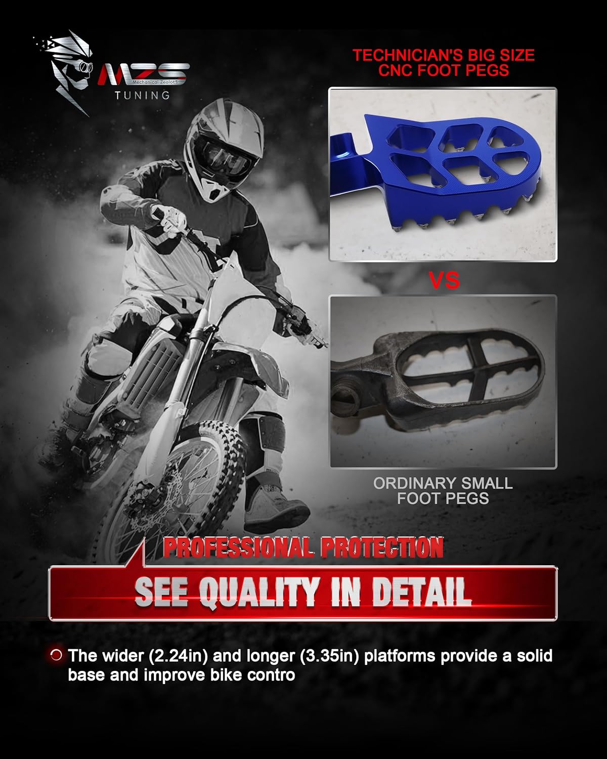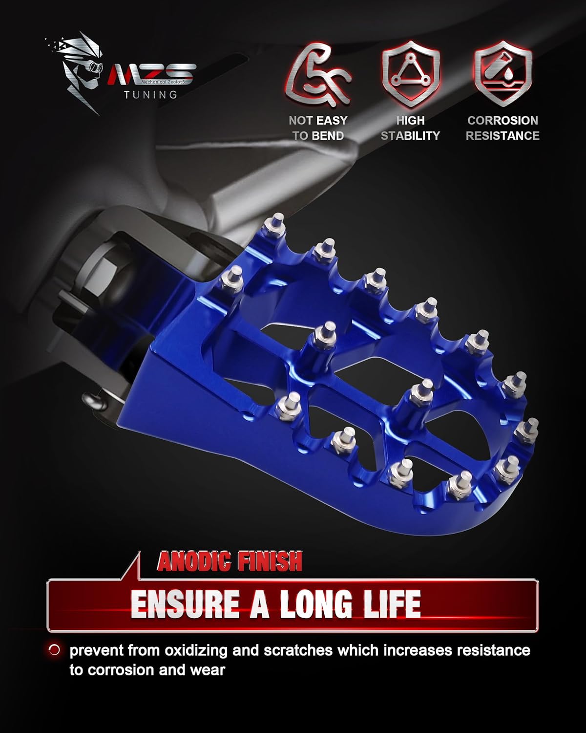 - PREMIUM MATERIAL - MZS motorcycle foot pegs made of modern 6061 T6 aluminum alloy integrated CNC process has good corrosion resistance and is not easy to get rust and long life. And more importantly, it has higher tensile strength and yield strength, and is not easily get damaged even under collision