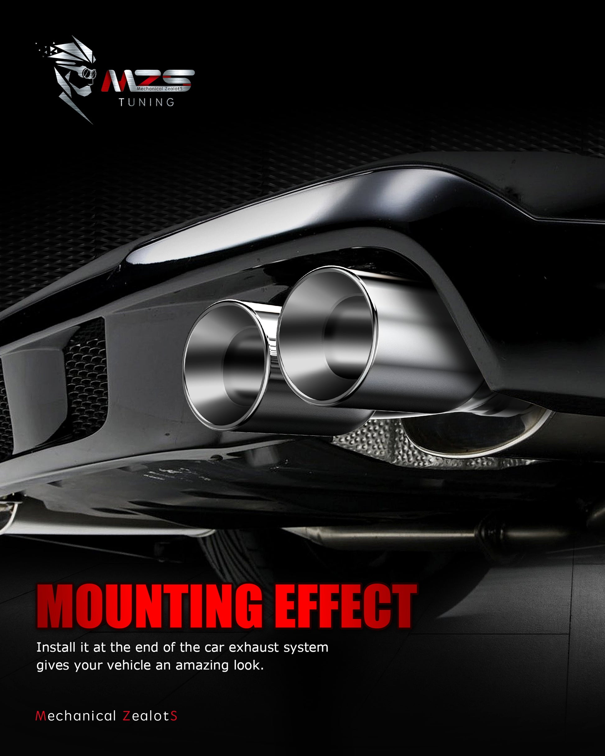 - Note: MZS exhaust tip has 2.5" inlet, 3.5" outlet, and length of 9.5". Please measure the size of your tail pipe before purchase, the outlet size of the tailpipe should match the inlet size of this exhaust tip.