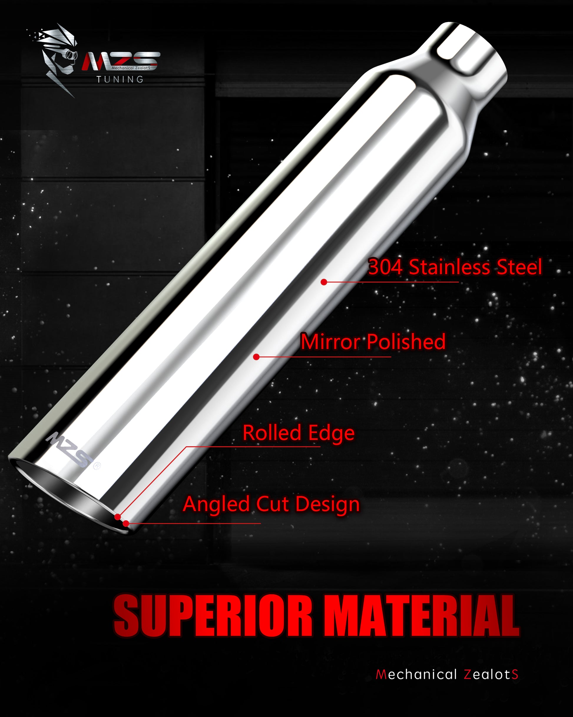 - Note: MZS exhaust tip has 2.5" inlet, 4" outlet, and length of 17". Please measure the size of your tail pipe before purchase, the outlet size of the tailpipe should match the inlet size of this exhaust tip.