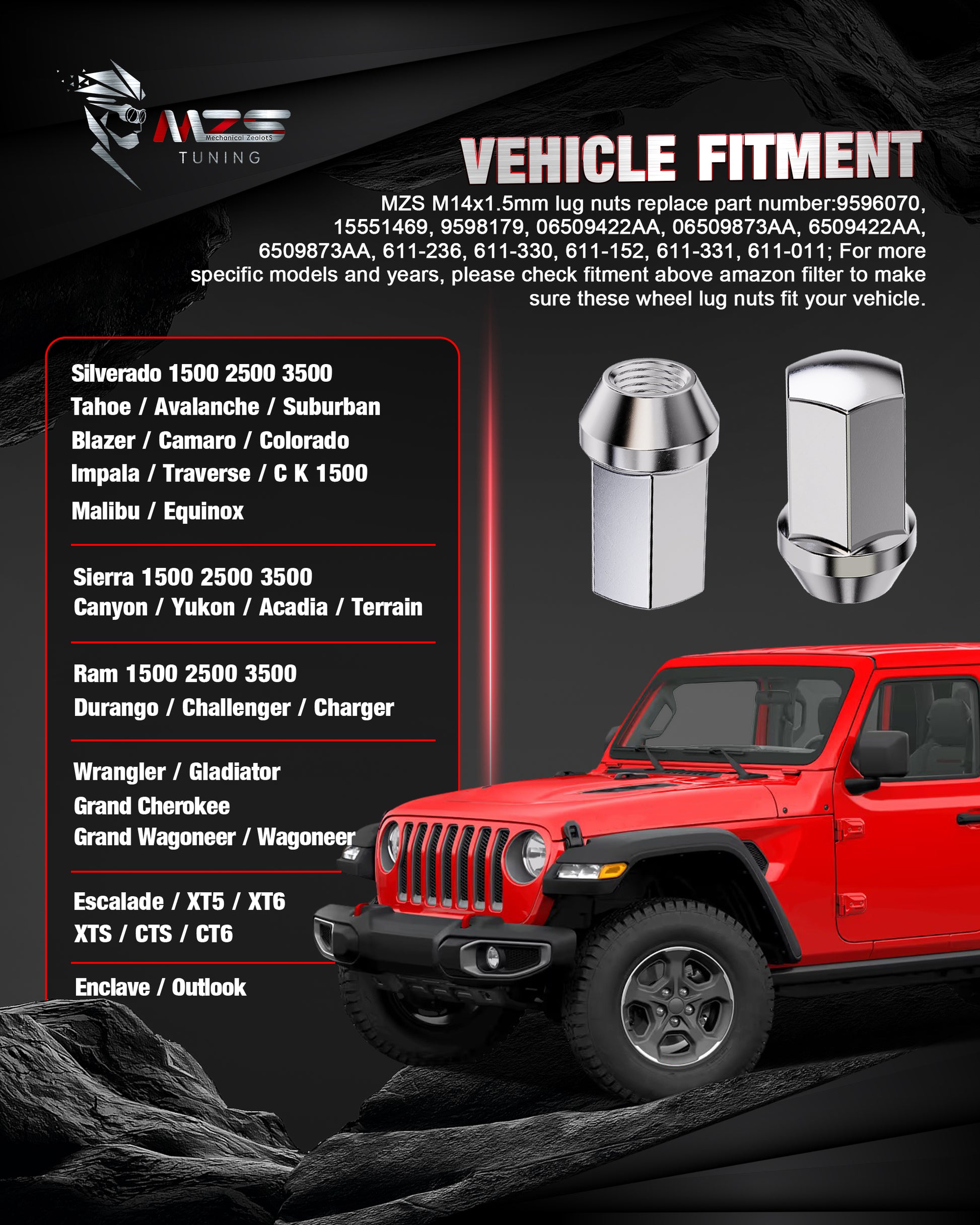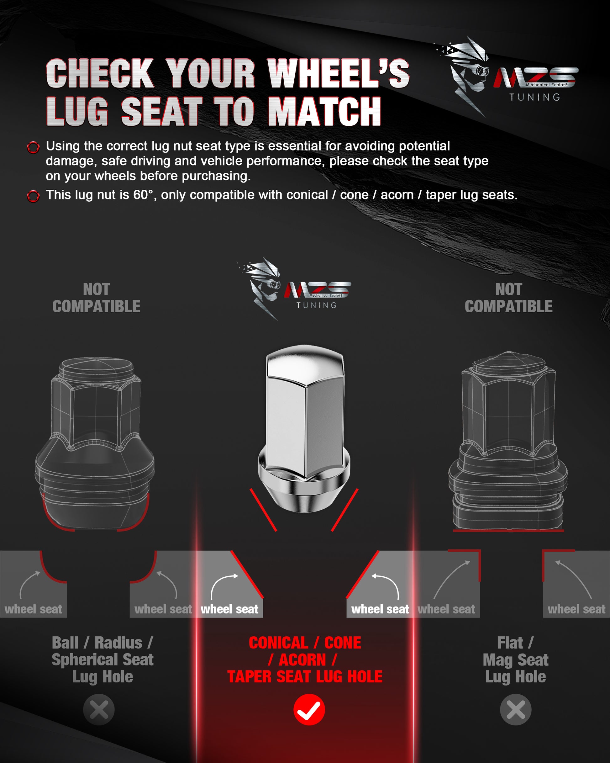 - Important Note: For more specific models and years, please check fitment above amazon filter to make sure these wheel lug nut fit your vehicle. Pay attention to check your wheels's lug seat, only compatible with conical / cone / acorn / taper lug seats