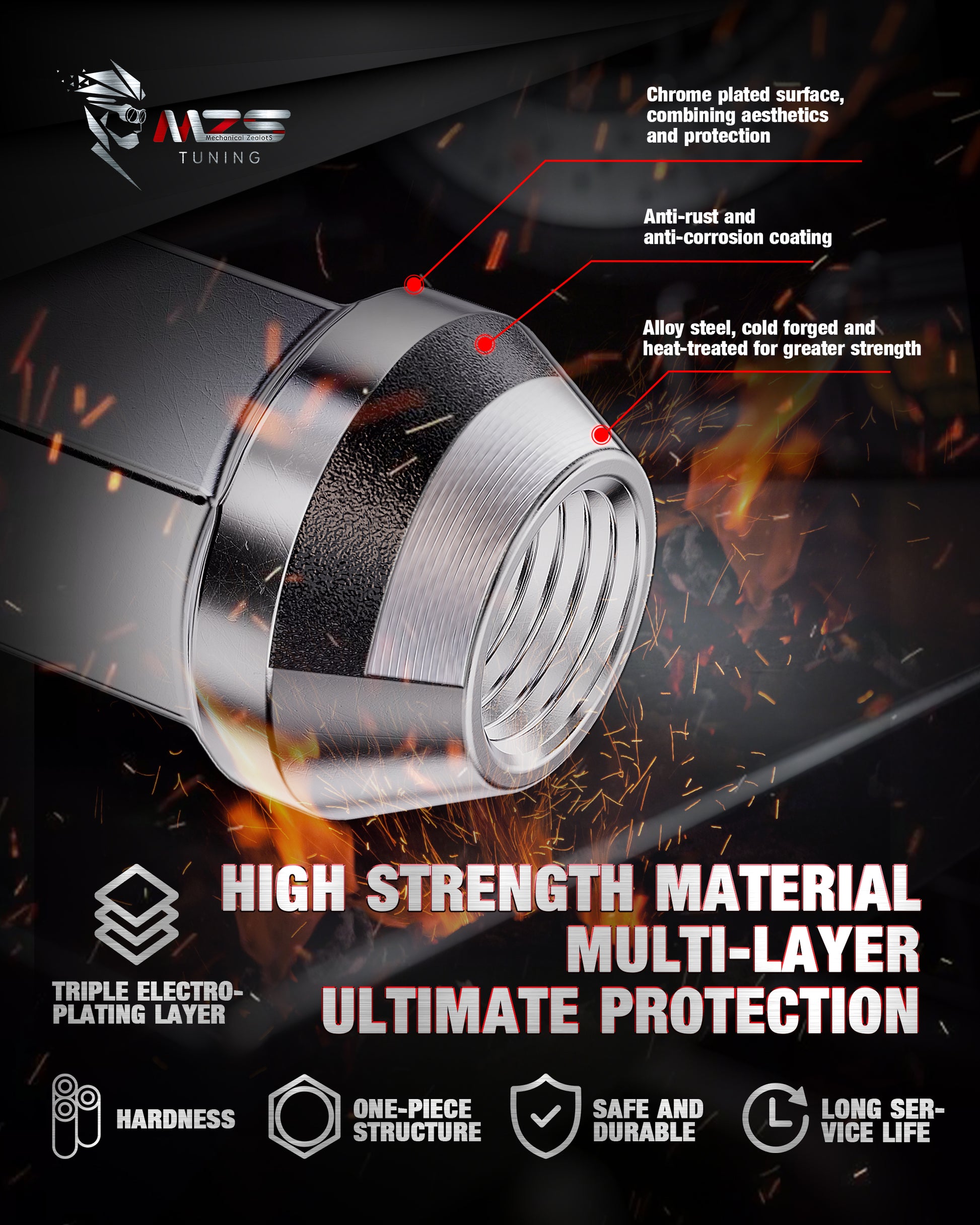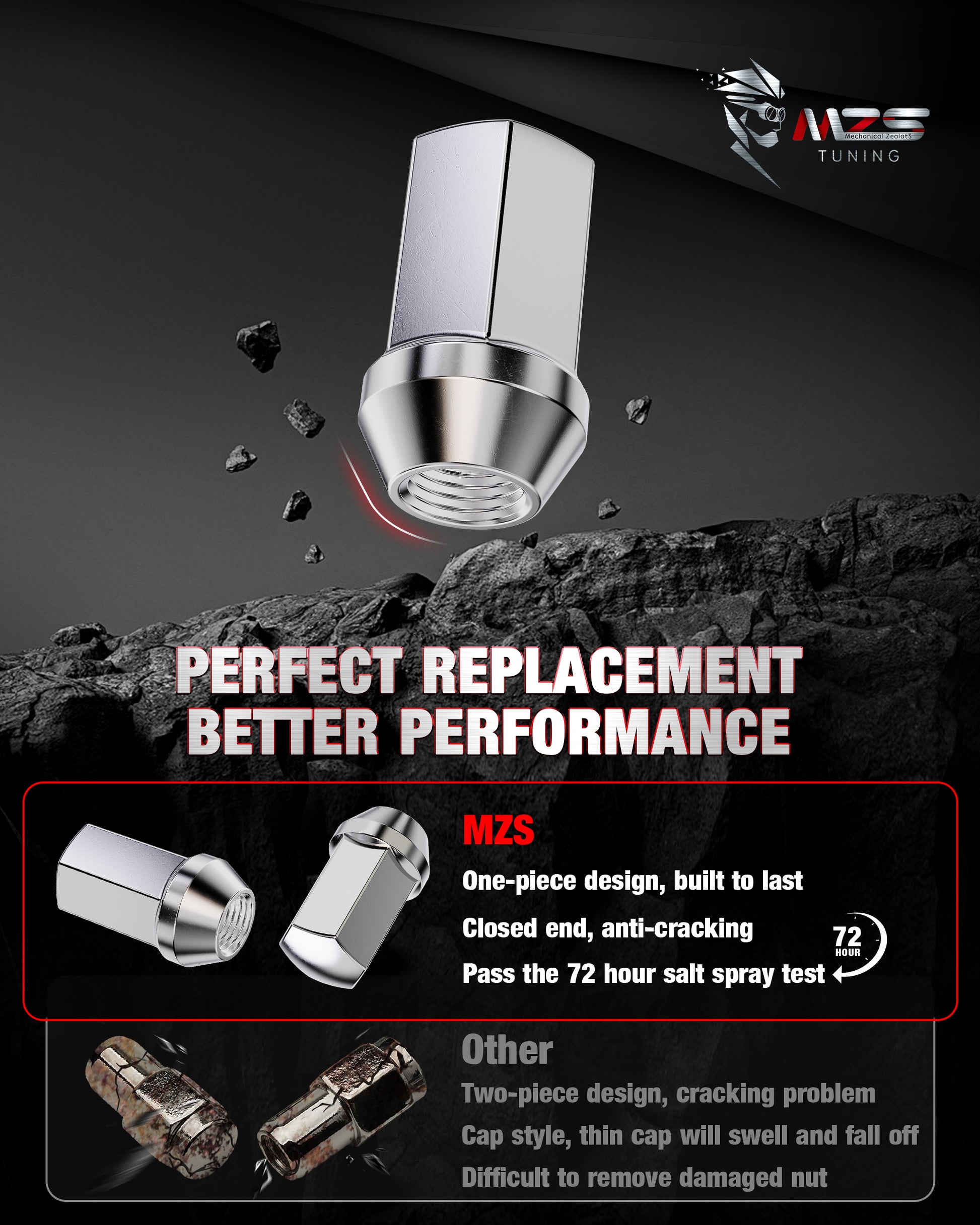 - One Piece Design: MZS lug nuts feature a solid one-piece construction, ensuring resistance to breaking, loosening, or cracking. Withstanding 72-hour salt-spray testing, they maintain refined integrity and perform reliably across varying weather conditions, standing the test of time