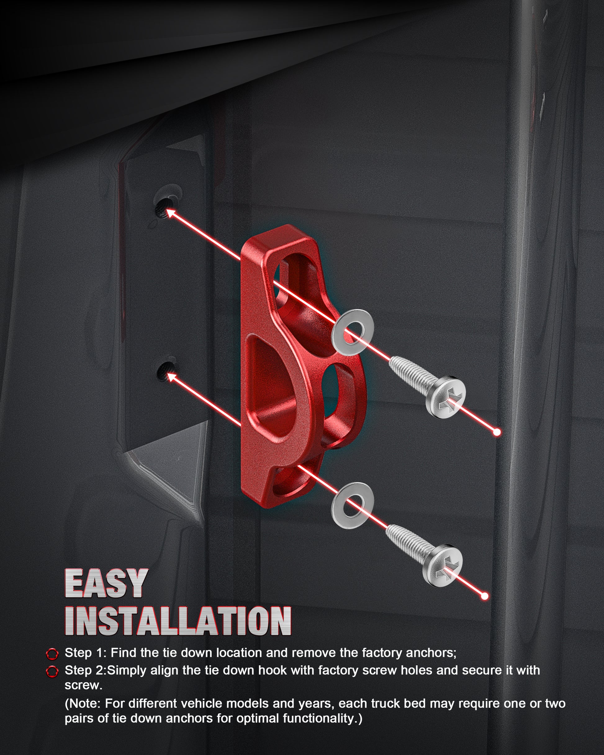 - Easy to Install: Remove the factory provided tie-down anchors, simply align the tie down hook with factory screw holes and fix it with supplied screw. No special tools needed, you will get a secure anchor point in minutes.
