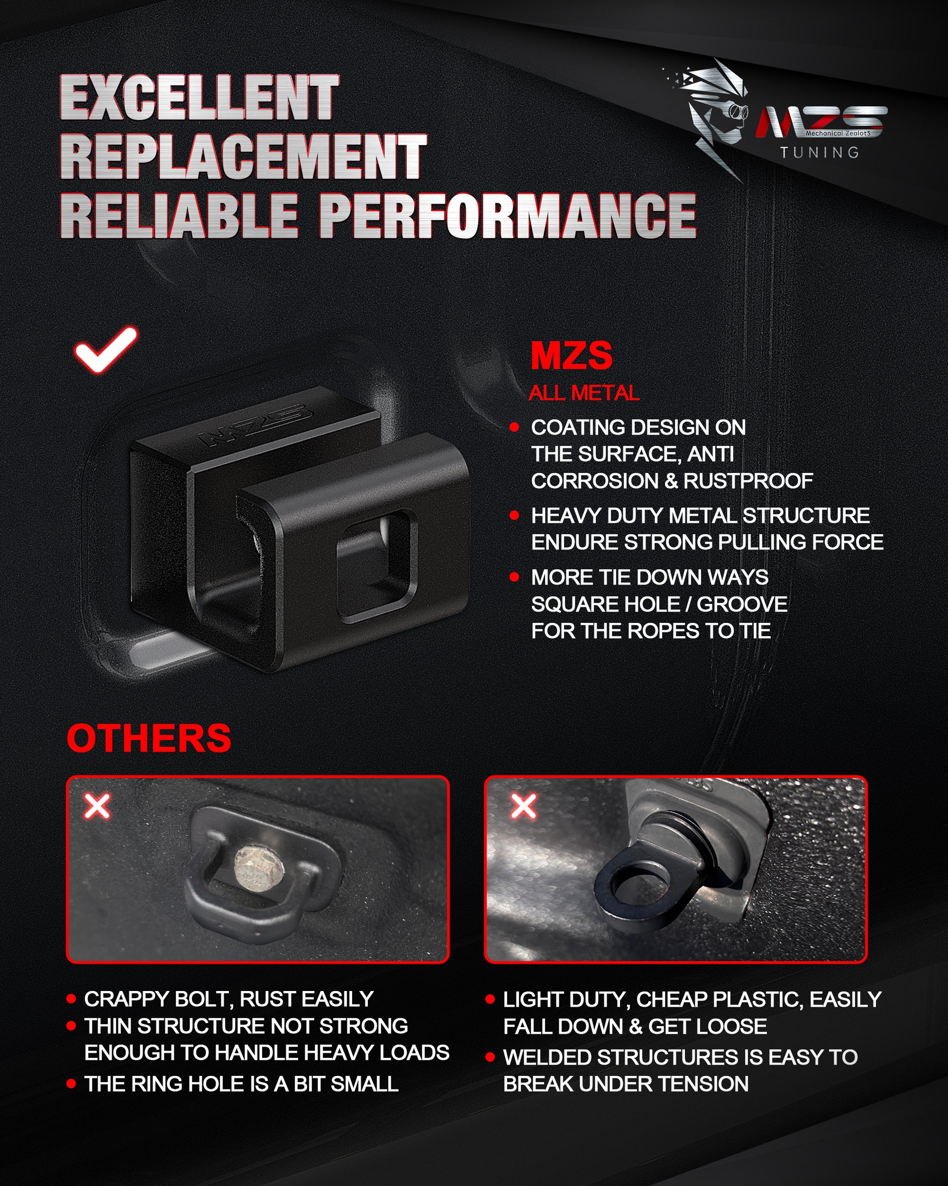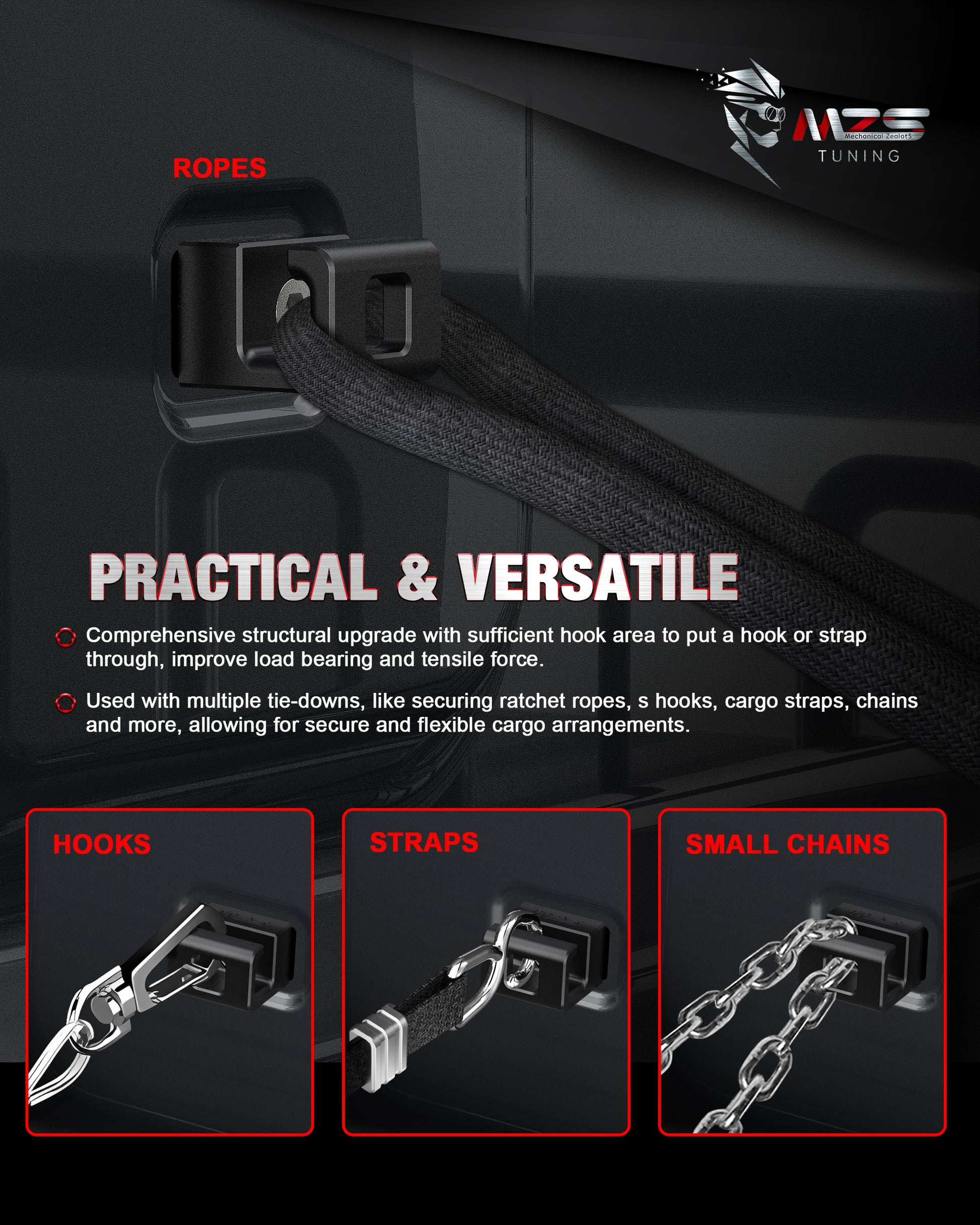 - Secure Anchor Points: MZS Tie Down Anchors provide additional cargo tie down points in your bed, helps you tie down objects securely to the truck bed, reduces cargo swing and noise during transport, allowing you have a safe driving