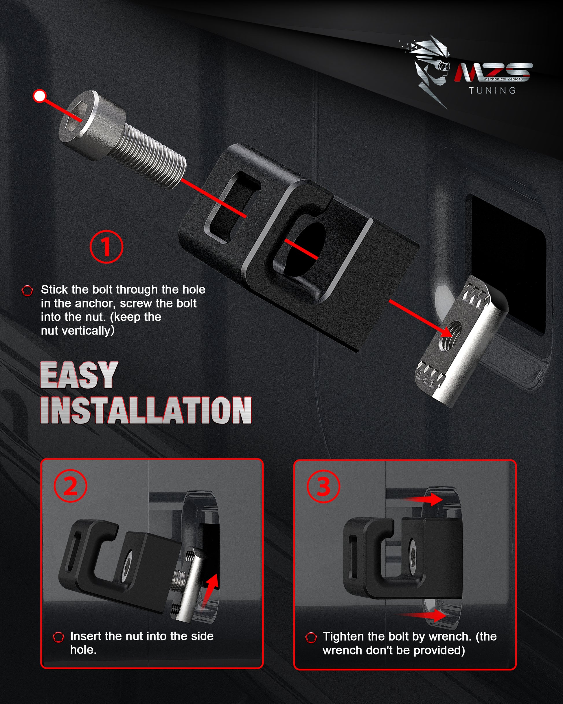 - Simple Installation: No drilling and special tools required, just take 3–5 minutes to remove the plastic cover, install the truck bed side wall anchor into existing holes in truck bed locations, and use a wrench to tighten the bolts (the wrench don't be provided)